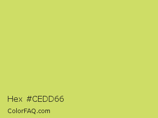 Hex #cedd66 Color is a light yellow color and the nearest color is Booger Buster #dde26a. Hex code #cedd66 and RGB value is rgb(206,221,102). In RGB color space, this color is composed of 81% red, 87% green, 40% blue, In CMYK color space, this color is composed of 7% cyan, 0% magenta, 54% yellow , 13% black , In HSL color space, this color has a hue angle of 68° , 64% saturation and 63% lightness.