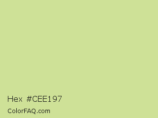 Hex #cee197 Color is a light lime color and the nearest color is Deco #d2da97. Hex code #cee197 and RGB value is rgb(206,225,151). In RGB color space, this color is composed of 81% red, 88% green, 59% blue, In CMYK color space, this color is composed of 8% cyan, 0% magenta, 33% yellow , 12% black , In HSL color space, this color has a hue angle of 75° , 55% saturation and 74% lightness.