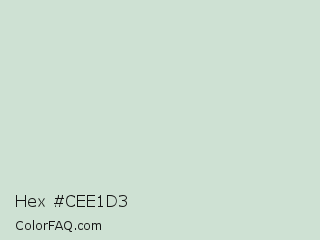 Hex #cee1d3 Color is a very light green color and the nearest color is Surf Crest #cfe5d2. Hex code #cee1d3 and RGB value is rgb(206,225,211). In RGB color space, this color is composed of 81% red, 88% green, 83% blue, In CMYK color space, this color is composed of 8% cyan, 0% magenta, 6% yellow , 12% black , In HSL color space, this color has a hue angle of 136° , 24% saturation and 85% lightness.