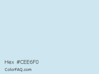 Hex #cee6f0 Color is a very light blue color and the nearest color is Link Water #d9e4f5. Hex code #cee6f0 and RGB value is rgb(206,230,240). In RGB color space, this color is composed of 81% red, 90% green, 94% blue, In CMYK color space, this color is composed of 14% cyan, 4% magenta, 0% yellow , 6% black , In HSL color space, this color has a hue angle of 198° , 53% saturation and 87% lightness.