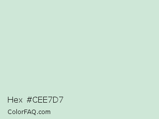 Hex #cee7d7 Color is a very light green color and the nearest color is Skeptic #cae6da. Hex code #cee7d7 and RGB value is rgb(206,231,215). In RGB color space, this color is composed of 81% red, 91% green, 84% blue, In CMYK color space, this color is composed of 11% cyan, 0% magenta, 7% yellow , 9% black , In HSL color space, this color has a hue angle of 142° , 34% saturation and 86% lightness.