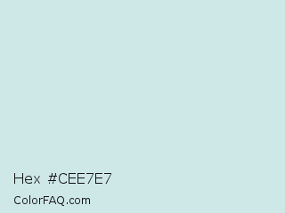 Hex #cee7e7 Color is a very light cyan color and the nearest color is Geyser #d4dfe2. Hex code #cee7e7 and RGB value is rgb(206,231,231). In RGB color space, this color is composed of 81% red, 91% green, 91% blue, In CMYK color space, this color is composed of 11% cyan, 0% magenta, 0% yellow , 9% black , In HSL color space, this color has a hue angle of 180° , 34% saturation and 86% lightness.