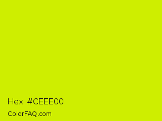 Hex #ceee00 Color is a normal yellow color and the nearest color is Volt #ceff00. Hex code #ceee00 and RGB value is rgb(206,238,0). In RGB color space, this color is composed of 81% red, 93% green, 0% blue, In CMYK color space, this color is composed of 13% cyan, 0% magenta, 100% yellow , 7% black , In HSL color space, this color has a hue angle of 68° , 100% saturation and 47% lightness.