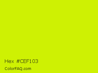 Hex #cef103 Color is a normal yellow color and the nearest color is Volt #ceff00. Hex code #cef103 and RGB value is rgb(206,241,3). In RGB color space, this color is composed of 81% red, 95% green, 1% blue, In CMYK color space, this color is composed of 15% cyan, 0% magenta, 99% yellow , 5% black , In HSL color space, this color has a hue angle of 69° , 98% saturation and 48% lightness.