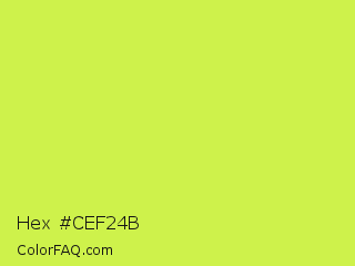 Hex #cef24b Color is a light lime color and the nearest color is Maximum Green Yellow #d9e650. Hex code #cef24b and RGB value is rgb(206,242,75). In RGB color space, this color is composed of 81% red, 95% green, 29% blue, In CMYK color space, this color is composed of 15% cyan, 0% magenta, 69% yellow , 5% black , In HSL color space, this color has a hue angle of 73° , 87% saturation and 62% lightness.