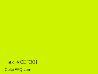 Hex #cef301 Color is a normal yellow color and the nearest color is Volt #ceff00. Hex code #cef301 and RGB value is rgb(206,243,1). In RGB color space, this color is composed of 81% red, 95% green, 0% blue, In CMYK color space, this color is composed of 15% cyan, 0% magenta, 100% yellow , 5% black , In HSL color space, this color has a hue angle of 69° , 99% saturation and 48% lightness.