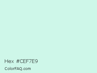 Hex #cef7e9 Color is a very light green color and the nearest color is Granny Apple #d5f6e3. Hex code #cef7e9 and RGB value is rgb(206,247,233). In RGB color space, this color is composed of 81% red, 97% green, 91% blue, In CMYK color space, this color is composed of 17% cyan, 0% magenta, 6% yellow , 3% black , In HSL color space, this color has a hue angle of 160° , 72% saturation and 89% lightness.