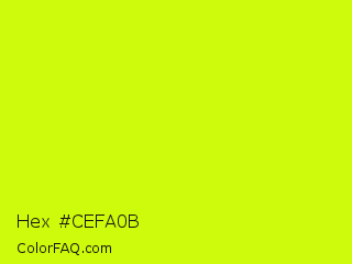 Hex #cefa0b Color is a normal lime color and the nearest color is Arctic Lime #d0ff14. Hex code #cefa0b and RGB value is rgb(206,250,11). In RGB color space, this color is composed of 81% red, 98% green, 4% blue, In CMYK color space, this color is composed of 18% cyan, 0% magenta, 96% yellow , 2% black , In HSL color space, this color has a hue angle of 71° , 96% saturation and 51% lightness.
