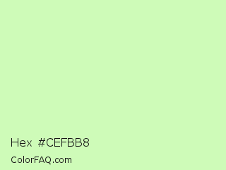 Hex #cefbb8 Color is a very light green color and the nearest color is Gossip #d2f8b0. Hex code #cefbb8 and RGB value is rgb(206,251,184). In RGB color space, this color is composed of 81% red, 98% green, 72% blue, In CMYK color space, this color is composed of 18% cyan, 0% magenta, 27% yellow , 2% black , In HSL color space, this color has a hue angle of 100° , 89% saturation and 85% lightness.