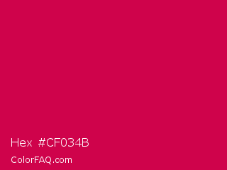 Hex #cf034b Color is a normal rose color and the nearest color is Spanish Carmine #d10047. Hex code #cf034b and RGB value is rgb(207,3,75). In RGB color space, this color is composed of 81% red, 1% green, 29% blue, In CMYK color space, this color is composed of 0% cyan, 99% magenta, 64% yellow , 19% black , In HSL color space, this color has a hue angle of 339° , 97% saturation and 41% lightness.