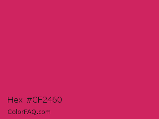 Hex #cf2460 Color is a normal rose color and the nearest color is Dogwood Rose #d71868. Hex code #cf2460 and RGB value is rgb(207,36,96). In RGB color space, this color is composed of 81% red, 14% green, 38% blue, In CMYK color space, this color is composed of 0% cyan, 83% magenta, 54% yellow , 19% black , In HSL color space, this color has a hue angle of 339° , 70% saturation and 48% lightness.