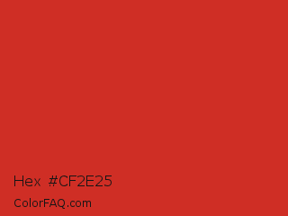 Hex #cf2e25 Color is a normal red color and the nearest color is Fire Engine Red #ce2029. Hex code #cf2e25 and RGB value is rgb(207,46,37). In RGB color space, this color is composed of 81% red, 18% green, 15% blue, In CMYK color space, this color is composed of 0% cyan, 78% magenta, 82% yellow , 19% black , In HSL color space, this color has a hue angle of 3° , 70% saturation and 48% lightness.