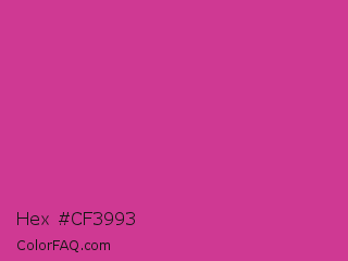 Hex #cf3993 Color is a normal magenta color and the nearest color is Magenta Pink #cc338b. Hex code #cf3993 and RGB value is rgb(207,57,147). In RGB color space, this color is composed of 81% red, 22% green, 58% blue, In CMYK color space, this color is composed of 0% cyan, 72% magenta, 29% yellow , 19% black , In HSL color space, this color has a hue angle of 324° , 61% saturation and 52% lightness.