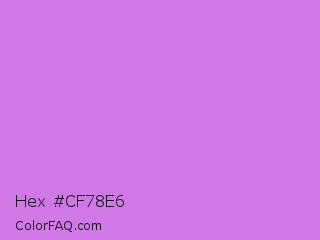 Hex #cf78e6 Color is a light purple color and the nearest color is French Mauve #d473d4. Hex code #cf78e6 and RGB value is rgb(207,120,230). In RGB color space, this color is composed of 81% red, 47% green, 90% blue, In CMYK color space, this color is composed of 10% cyan, 48% magenta, 0% yellow , 10% black , In HSL color space, this color has a hue angle of 287° , 69% saturation and 69% lightness.