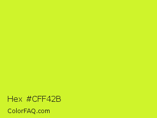 Hex #cff42b Color is a normal lime color and the nearest color is Pear #d1e231. Hex code #cff42b and RGB value is rgb(207,244,43). In RGB color space, this color is composed of 81% red, 96% green, 17% blue, In CMYK color space, this color is composed of 15% cyan, 0% magenta, 82% yellow , 4% black , In HSL color space, this color has a hue angle of 71° , 90% saturation and 56% lightness.