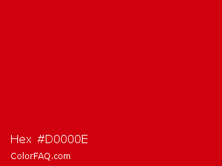 Hex #d0000e Color is a normal red color and the nearest color is Harvard Crimson #c90016. Hex code #d0000e and RGB value is rgb(208,0,14). In RGB color space, this color is composed of 82% red, 0% green, 5% blue, In CMYK color space, this color is composed of 0% cyan, 100% magenta, 93% yellow , 18% black , In HSL color space, this color has a hue angle of 356° , 100% saturation and 41% lightness.