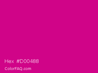 Hex #d00488 Color is a normal magenta color and the nearest color is Red Violet #c71585. Hex code #d00488 and RGB value is rgb(208,4,136). In RGB color space, this color is composed of 82% red, 2% green, 53% blue, In CMYK color space, this color is composed of 0% cyan, 98% magenta, 35% yellow , 18% black , In HSL color space, this color has a hue angle of 321° , 96% saturation and 42% lightness.