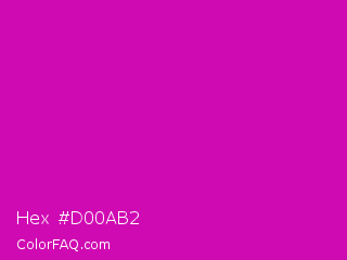 Hex #d00ab2 Color is a normal magenta color and the nearest color is Deep Magenta #cc00cc. Hex code #d00ab2 and RGB value is rgb(208,10,178). In RGB color space, this color is composed of 82% red, 4% green, 70% blue, In CMYK color space, this color is composed of 0% cyan, 95% magenta, 14% yellow , 18% black , In HSL color space, this color has a hue angle of 309° , 91% saturation and 43% lightness.