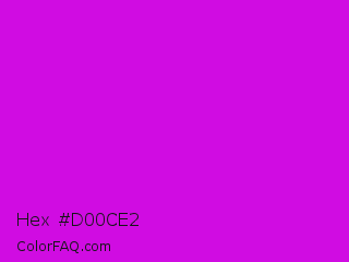 Hex #d00ce2 Color is a normal magenta color and the nearest color is Vivid Mulberry #b80ce3. Hex code #d00ce2 and RGB value is rgb(208,12,226). In RGB color space, this color is composed of 82% red, 5% green, 89% blue, In CMYK color space, this color is composed of 8% cyan, 95% magenta, 0% yellow , 11% black , In HSL color space, this color has a hue angle of 295° , 90% saturation and 47% lightness.
