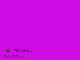 Hex #d00de5 Color is a normal magenta color and the nearest color is Vivid Mulberry #b80ce3. Hex code #d00de5 and RGB value is rgb(208,13,229). In RGB color space, this color is composed of 82% red, 5% green, 90% blue, In CMYK color space, this color is composed of 9% cyan, 94% magenta, 0% yellow , 10% black , In HSL color space, this color has a hue angle of 294° , 89% saturation and 47% lightness.