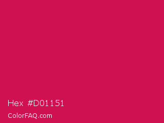 Hex #d01151 Color is a normal rose color and the nearest color is Debian Red #d70a53. Hex code #d01151 and RGB value is rgb(208,17,81). In RGB color space, this color is composed of 82% red, 7% green, 32% blue, In CMYK color space, this color is composed of 0% cyan, 92% magenta, 61% yellow , 18% black , In HSL color space, this color has a hue angle of 340° , 85% saturation and 44% lightness.
