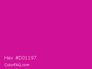 Hex #d01197 Color is a normal magenta color and the nearest color is Red Violet #c71585. Hex code #d01197 and RGB value is rgb(208,17,151). In RGB color space, this color is composed of 82% red, 7% green, 59% blue, In CMYK color space, this color is composed of 0% cyan, 92% magenta, 27% yellow , 18% black , In HSL color space, this color has a hue angle of 318° , 85% saturation and 44% lightness.