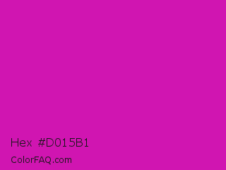 Hex #d015b1 Color is a normal magenta color and the nearest color is Deep Magenta #cc00cc. Hex code #d015b1 and RGB value is rgb(208,21,177). In RGB color space, this color is composed of 82% red, 8% green, 69% blue, In CMYK color space, this color is composed of 0% cyan, 90% magenta, 15% yellow , 18% black , In HSL color space, this color has a hue angle of 310° , 82% saturation and 45% lightness.