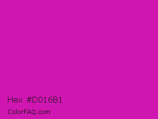 Hex #d016b1 Color is a normal magenta color and the nearest color is Deep Magenta #cc00cc. Hex code #d016b1 and RGB value is rgb(208,22,177). In RGB color space, this color is composed of 82% red, 9% green, 69% blue, In CMYK color space, this color is composed of 0% cyan, 89% magenta, 15% yellow , 18% black , In HSL color space, this color has a hue angle of 310° , 81% saturation and 45% lightness.