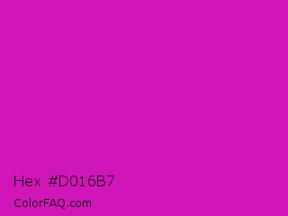 Hex #d016b7 Color is a normal magenta color and the nearest color is Deep Magenta #cc00cc. Hex code #d016b7 and RGB value is rgb(208,22,183). In RGB color space, this color is composed of 82% red, 9% green, 72% blue, In CMYK color space, this color is composed of 0% cyan, 89% magenta, 12% yellow , 18% black , In HSL color space, this color has a hue angle of 308° , 81% saturation and 45% lightness.