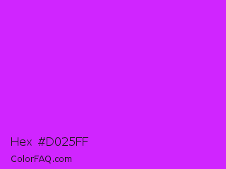 Hex #d025ff Color is a normal purple color and the nearest color is Vivid Orchid #cc00ff. Hex code #d025ff and RGB value is rgb(208,37,255). In RGB color space, this color is composed of 82% red, 15% green, 100% blue, In CMYK color space, this color is composed of 18% cyan, 85% magenta, 0% yellow , 0% black , In HSL color space, this color has a hue angle of 287° , 100% saturation and 57% lightness.