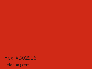 Hex #d02916 Color is a normal red color and the nearest color is Thunderbird #c02b18. Hex code #d02916 and RGB value is rgb(208,41,22). In RGB color space, this color is composed of 82% red, 16% green, 9% blue, In CMYK color space, this color is composed of 0% cyan, 80% magenta, 89% yellow , 18% black , In HSL color space, this color has a hue angle of 6° , 81% saturation and 45% lightness.