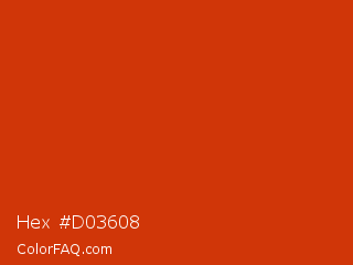 Hex #d03608 Color is a normal red color and the nearest color is Sinopia #cb410b. Hex code #d03608 and RGB value is rgb(208,54,8). In RGB color space, this color is composed of 82% red, 21% green, 3% blue, In CMYK color space, this color is composed of 0% cyan, 74% magenta, 96% yellow , 18% black , In HSL color space, this color has a hue angle of 14° , 93% saturation and 42% lightness.