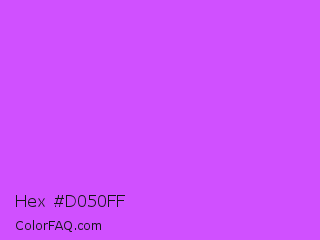 Hex #d050ff Color is a light purple color and the nearest color is Heliotrope #df73ff. Hex code #d050ff and RGB value is rgb(208,80,255). In RGB color space, this color is composed of 82% red, 31% green, 100% blue, In CMYK color space, this color is composed of 18% cyan, 69% magenta, 0% yellow , 0% black , In HSL color space, this color has a hue angle of 284° , 100% saturation and 66% lightness.