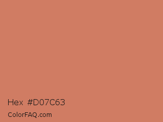 Hex #d07c63 Color is a normal red color and the nearest color is Japonica #d87c63. Hex code #d07c63 and RGB value is rgb(208,124,99). In RGB color space, this color is composed of 82% red, 49% green, 39% blue, In CMYK color space, this color is composed of 0% cyan, 40% magenta, 52% yellow , 18% black , In HSL color space, this color has a hue angle of 14° , 54% saturation and 60% lightness.