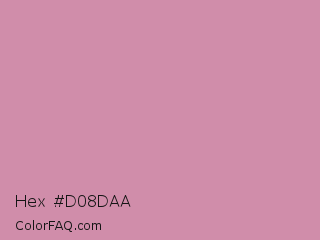 Hex #d08daa Color is a light rose color and the nearest color is Viola #cb8fa9. Hex code #d08daa and RGB value is rgb(208,141,170). In RGB color space, this color is composed of 82% red, 55% green, 67% blue, In CMYK color space, this color is composed of 0% cyan, 32% magenta, 18% yellow , 18% black , In HSL color space, this color has a hue angle of 334° , 42% saturation and 68% lightness.
