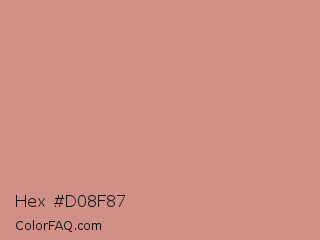 Hex #d08f87 Color is a light red color and the nearest color is My Pink #d69188. Hex code #d08f87 and RGB value is rgb(208,143,135). In RGB color space, this color is composed of 82% red, 56% green, 53% blue, In CMYK color space, this color is composed of 0% cyan, 31% magenta, 35% yellow , 18% black , In HSL color space, this color has a hue angle of 7° , 44% saturation and 67% lightness.