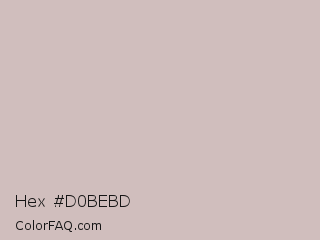 Hex #d0bebd Color is a light red color and the nearest color is Cold Turkey #cebaba. Hex code #d0bebd and RGB value is rgb(208,190,189). In RGB color space, this color is composed of 82% red, 75% green, 74% blue, In CMYK color space, this color is composed of 0% cyan, 9% magenta, 9% yellow , 18% black , In HSL color space, this color has a hue angle of 3° , 17% saturation and 78% lightness.