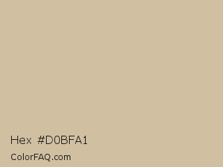 Hex #d0bfa1 Color is a light orange color and the nearest color is Vanilla #d1bea8. Hex code #d0bfa1 and RGB value is rgb(208,191,161). In RGB color space, this color is composed of 82% red, 75% green, 63% blue, In CMYK color space, this color is composed of 0% cyan, 8% magenta, 23% yellow , 18% black , In HSL color space, this color has a hue angle of 38° , 33% saturation and 72% lightness.