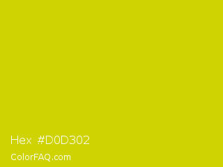Hex #d0d302 Color is a normal yellow color and the nearest color is Bitter Lemon #cae00d. Hex code #d0d302 and RGB value is rgb(208,211,2). In RGB color space, this color is composed of 82% red, 83% green, 1% blue, In CMYK color space, this color is composed of 1% cyan, 0% magenta, 99% yellow , 17% black , In HSL color space, this color has a hue angle of 61° , 98% saturation and 42% lightness.