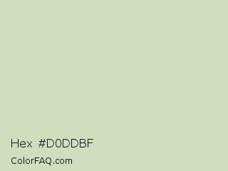 Hex #d0ddbf Color is a very light green color and the nearest color is Tana #d9dcc1. Hex code #d0ddbf and RGB value is rgb(208,221,191). In RGB color space, this color is composed of 82% red, 87% green, 75% blue, In CMYK color space, this color is composed of 6% cyan, 0% magenta, 14% yellow , 13% black , In HSL color space, this color has a hue angle of 86° , 31% saturation and 81% lightness.
