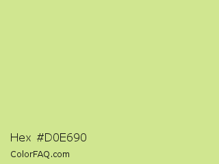 Hex #d0e690 Color is a light lime color and the nearest color is Deco #d2da97. Hex code #d0e690 and RGB value is rgb(208,230,144). In RGB color space, this color is composed of 82% red, 90% green, 56% blue, In CMYK color space, this color is composed of 10% cyan, 0% magenta, 37% yellow , 10% black , In HSL color space, this color has a hue angle of 75° , 63% saturation and 73% lightness.
