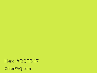 Hex #d0eb47 Color is a normal yellow color and the nearest color is Maximum Green Yellow #d9e650. Hex code #d0eb47 and RGB value is rgb(208,235,71). In RGB color space, this color is composed of 82% red, 92% green, 28% blue, In CMYK color space, this color is composed of 11% cyan, 0% magenta, 70% yellow , 8% black , In HSL color space, this color has a hue angle of 70° , 80% saturation and 60% lightness.