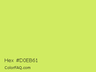 Hex #d0eb61 Color is a light lime color and the nearest color is Booger Buster #dde26a. Hex code #d0eb61 and RGB value is rgb(208,235,97). In RGB color space, this color is composed of 82% red, 92% green, 38% blue, In CMYK color space, this color is composed of 11% cyan, 0% magenta, 59% yellow , 8% black , In HSL color space, this color has a hue angle of 72° , 78% saturation and 65% lightness.