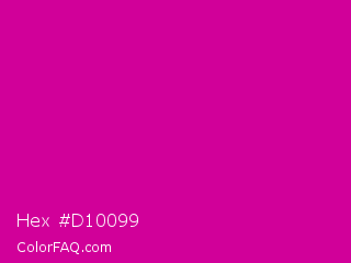 Hex #d10099 Color is a normal magenta color and the nearest color is Red Violet #c71585. Hex code #d10099 and RGB value is rgb(209,0,153). In RGB color space, this color is composed of 82% red, 0% green, 60% blue, In CMYK color space, this color is composed of 0% cyan, 100% magenta, 27% yellow , 18% black , In HSL color space, this color has a hue angle of 316° , 100% saturation and 41% lightness.