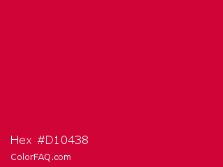 Hex #d10438 Color is a normal red color and the nearest color is Vivid Crimson #cc0033. Hex code #d10438 and RGB value is rgb(209,4,56). In RGB color space, this color is composed of 82% red, 2% green, 22% blue, In CMYK color space, this color is composed of 0% cyan, 98% magenta, 73% yellow , 18% black , In HSL color space, this color has a hue angle of 345° , 96% saturation and 42% lightness.