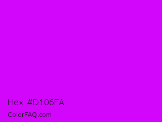 Hex #d106fa Color is a normal purple color and the nearest color is Vivid Orchid #cc00ff. Hex code #d106fa and RGB value is rgb(209,6,250). In RGB color space, this color is composed of 82% red, 2% green, 98% blue, In CMYK color space, this color is composed of 16% cyan, 98% magenta, 0% yellow , 2% black , In HSL color space, this color has a hue angle of 290° , 96% saturation and 50% lightness.