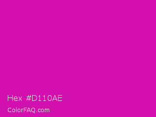 Hex #d110ae Color is a normal magenta color and the nearest color is Deep Magenta #cc00cc. Hex code #d110ae and RGB value is rgb(209,16,174). In RGB color space, this color is composed of 82% red, 6% green, 68% blue, In CMYK color space, this color is composed of 0% cyan, 92% magenta, 17% yellow , 18% black , In HSL color space, this color has a hue angle of 311° , 86% saturation and 44% lightness.