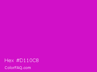Hex #d110c8 Color is a normal magenta color and the nearest color is Deep Magenta #cc00cc. Hex code #d110c8 and RGB value is rgb(209,16,200). In RGB color space, this color is composed of 82% red, 6% green, 78% blue, In CMYK color space, this color is composed of 0% cyan, 92% magenta, 4% yellow , 18% black , In HSL color space, this color has a hue angle of 303° , 86% saturation and 44% lightness.