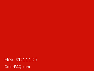 Hex #d11106 Color is a normal red color and the nearest color is Rosso Corsa #d40000. Hex code #d11106 and RGB value is rgb(209,17,6). In RGB color space, this color is composed of 82% red, 7% green, 2% blue, In CMYK color space, this color is composed of 0% cyan, 92% magenta, 97% yellow , 18% black , In HSL color space, this color has a hue angle of 3° , 94% saturation and 42% lightness.