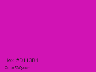 Hex #d113b4 Color is a normal magenta color and the nearest color is Deep Magenta #cc00cc. Hex code #d113b4 and RGB value is rgb(209,19,180). In RGB color space, this color is composed of 82% red, 7% green, 71% blue, In CMYK color space, this color is composed of 0% cyan, 91% magenta, 14% yellow , 18% black , In HSL color space, this color has a hue angle of 309° , 83% saturation and 45% lightness.